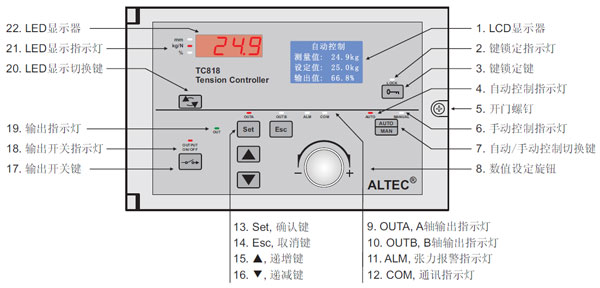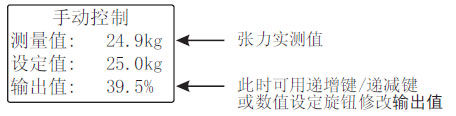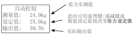 當(dāng)控制器工作在自動控制模式時,自動控制指示燈(AUTO)點亮,可旋轉(zhuǎn)數(shù)值設(shè)定旋鈕或按遞增鍵/遞減鍵修改張力設(shè)定值,按AUTO/MAN鍵可切換到手動控制模式。