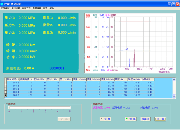 液壓馬達(dá)測試系統(tǒng)采用磁粉制動器作加載器;采用磁電型扭矩傳感器測量液壓馬達(dá)、氣壓馬達(dá)、氣動馬達(dá)的輸出轉(zhuǎn)矩轉(zhuǎn)速;采用流量變送器測量流量;采用壓力變送器測量液壓(氣壓);采用數(shù)字溫度傳感器測量溫度。
